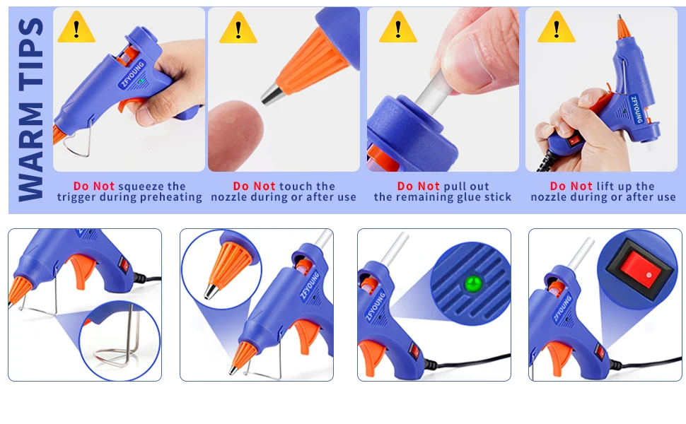 ?Bocal Anti-Gotejamento com Proteção de Borracha •: Nossa pistola de cola derretida tem um bico especial projetado anti-gotejamento com protetor de borracha, que é para evitar escaldadura e vazamento de cola e garantir a máxima segurança.